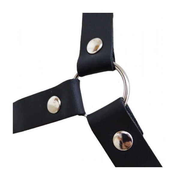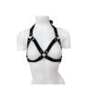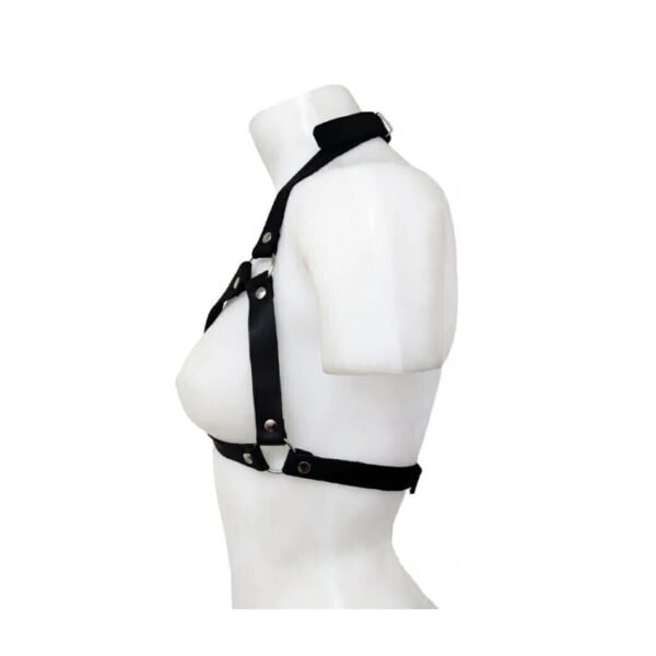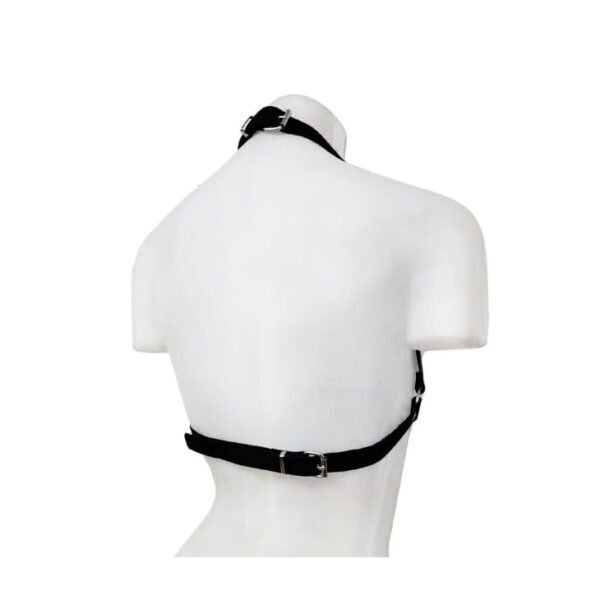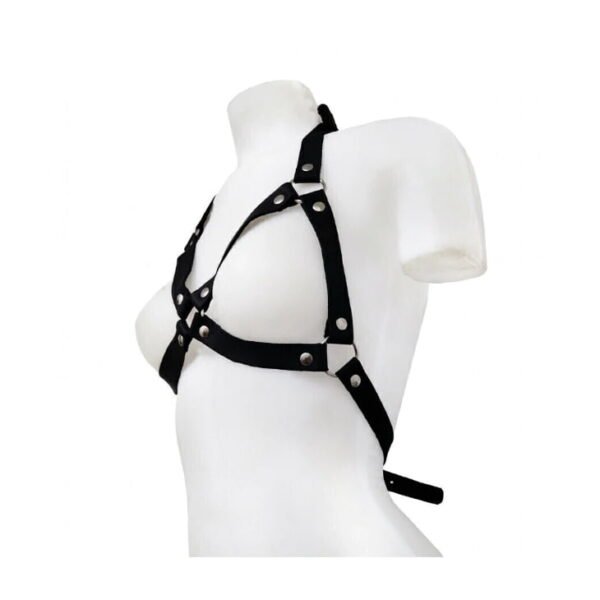 Sexy arnés femenino tipo corpiño fabricado en cuero, con broches ajustables en el cuello y la espalda para una mayor comodidad